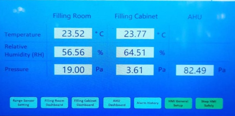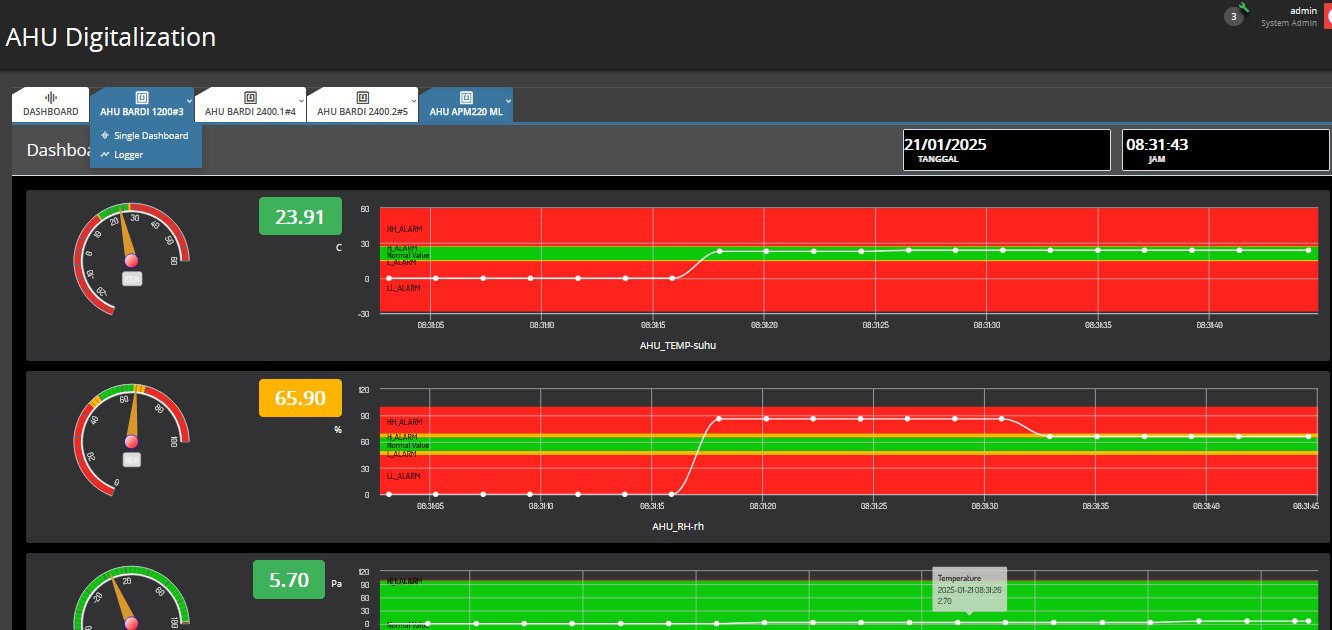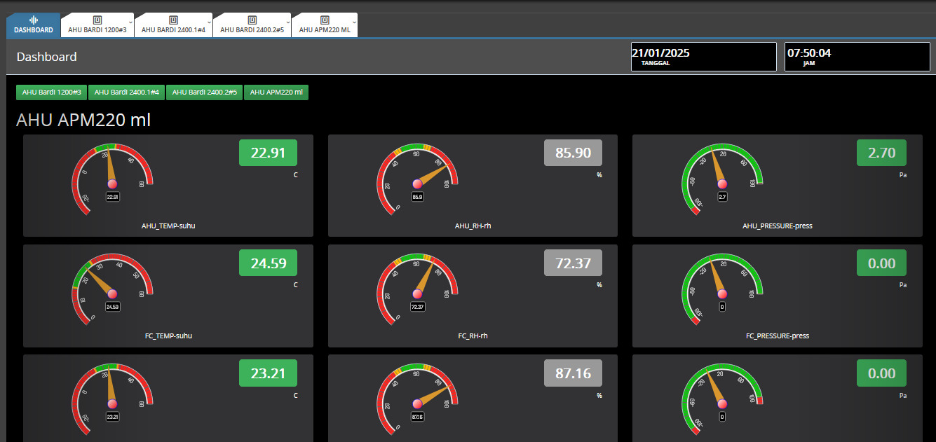 Maintaining a clean room environment poses significant challenges, including the need to monitor critical parameters such as temperature, humidity, and differential pressure to ensure compliance with strict standards. The AHU Monitoring Solution addresses these challenges by providing a comprehensive, web-based system for real-time monitoring and control. Users can set upper and lower limits for all parameters and receive instant alarm notifications when any of the seven monitored metrics fall out of range. With intuitive graphical trend analysis, this solution enables users to evaluate environmental performance, measure effectiveness, and adapt strategies or habits based on data insights. By integrating the monitoring of Air Handling Units (AHUs)—key components of HVAC systems that regulate air circulation, temperature, and cleanliness—this solution ensures precise and efficient management of clean room environments.