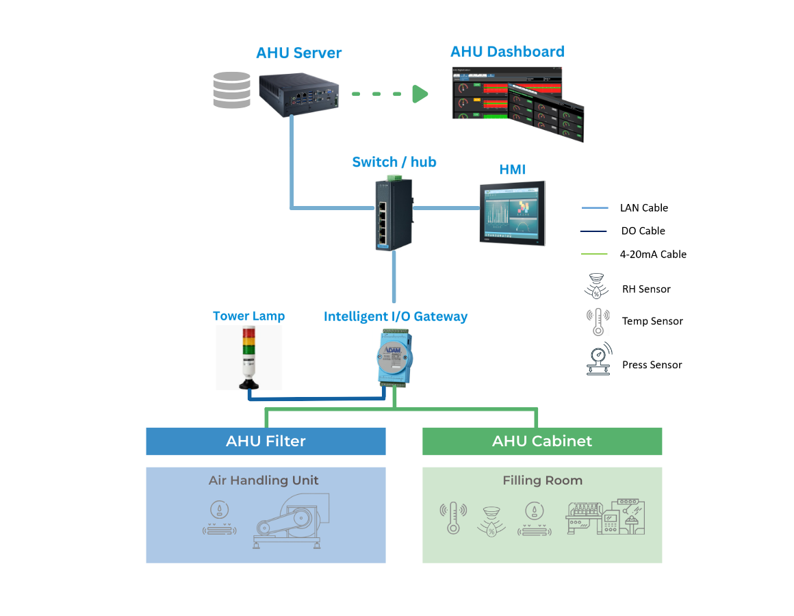 Maintaining a clean room environment poses significant challenges, including the need to monitor critical parameters such as temperature, humidity, and differential pressure to ensure compliance with strict standards. The AHU Monitoring Solution addresses these challenges by providing a comprehensive, web-based system for real-time monitoring and control. Users can set upper and lower limits for all parameters and receive instant alarm notifications when any of the seven monitored metrics fall out of range. With intuitive graphical trend analysis, this solution enables users to evaluate environmental performance, measure effectiveness, and adapt strategies or habits based on data insights. By integrating the monitoring of Air Handling Units (AHUs)—key components of HVAC systems that regulate air circulation, temperature, and cleanliness—this solution ensures precise and efficient management of clean room environments.